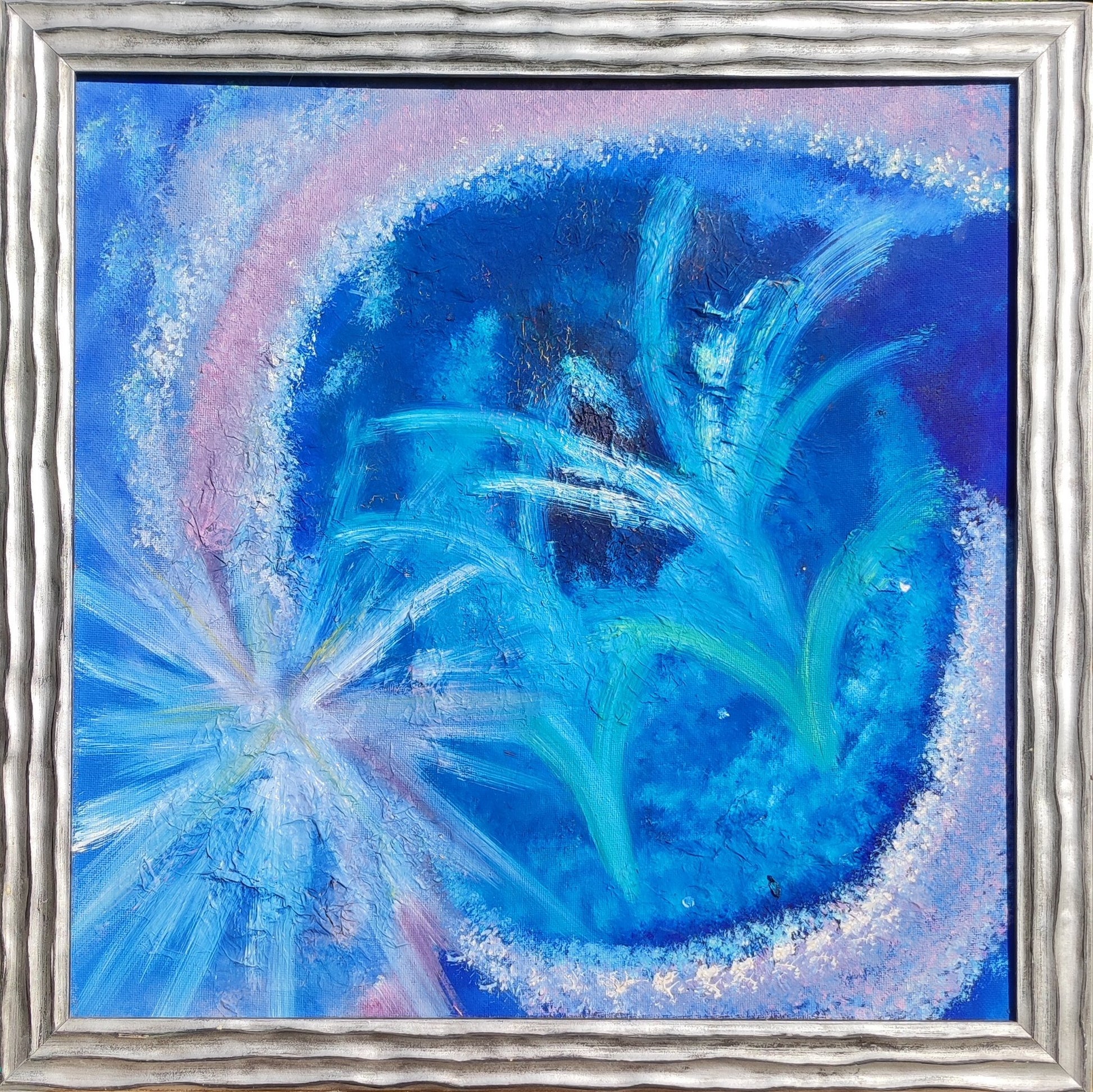 Das Farbschema basiert auf tiefen Blau- und Türkistönen , die Tiefe, inneren Raum und Frieden symbolisieren. Die hellen Ränder des Kreises schaffen einen Übergang zwischen der inneren und der äußeren Welt und verstärken so das Gefühl von Schutz und Ganzheit.