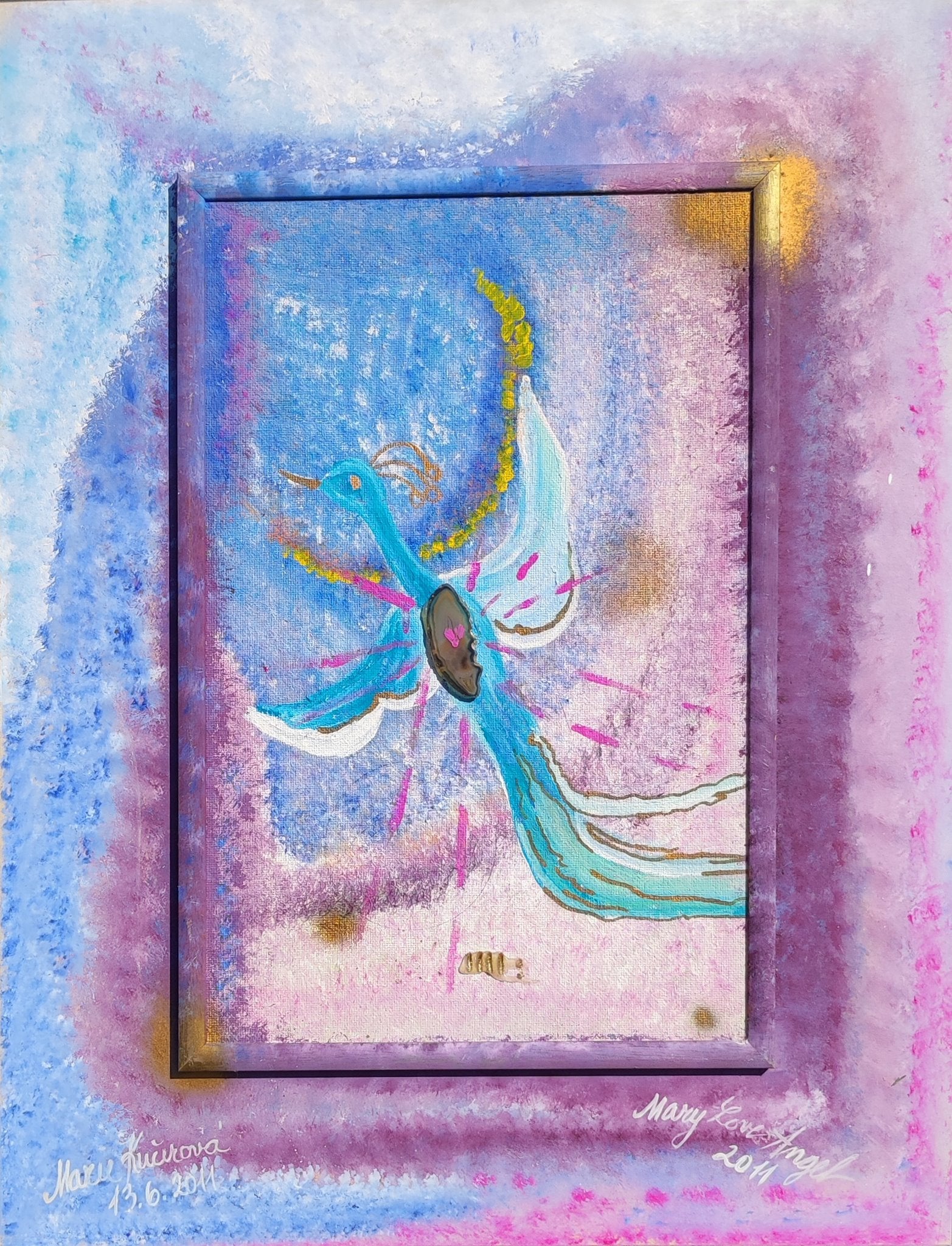 Die Komposition basiert auf einer diagonalen Achse , die Richtung und leichte Spannung erzeugt. Der Körper des Vogels ist in fließende Linien reduziert, die sich harmonisch in den Raum einfügen. Türkis- und Blautöne verstärken den Eindruck von Leichtigkeit und Dynamik, während Akzente in Rosa und Gold subtile Emotionalität und Glanz verleihen.