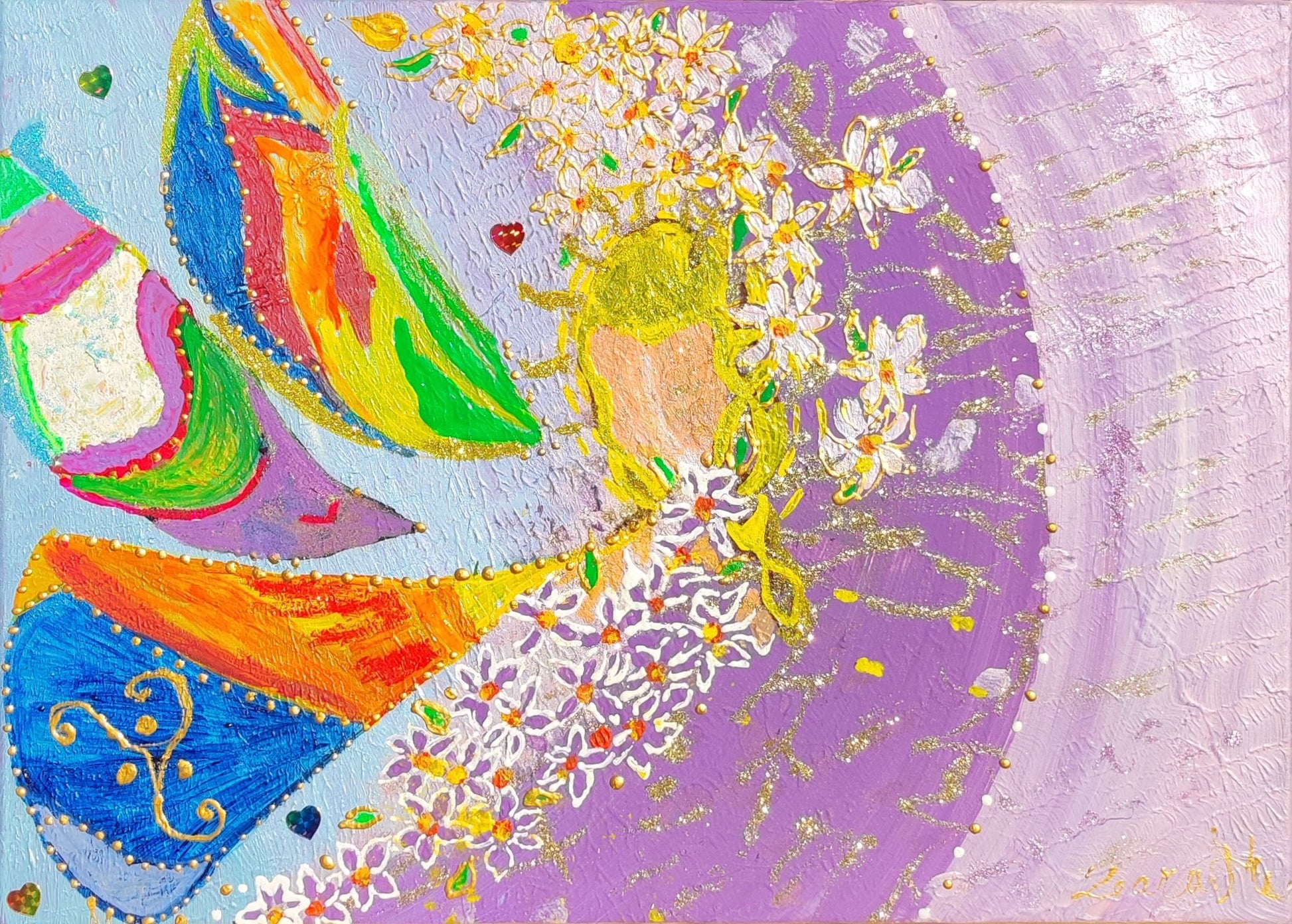 Durch die Verwendung von aufgesetzten Punkten, Metallicfarben und Strukturen wird das Bild lebendig – es verändert sich je nach Lichteinfall und Blickwinkel.