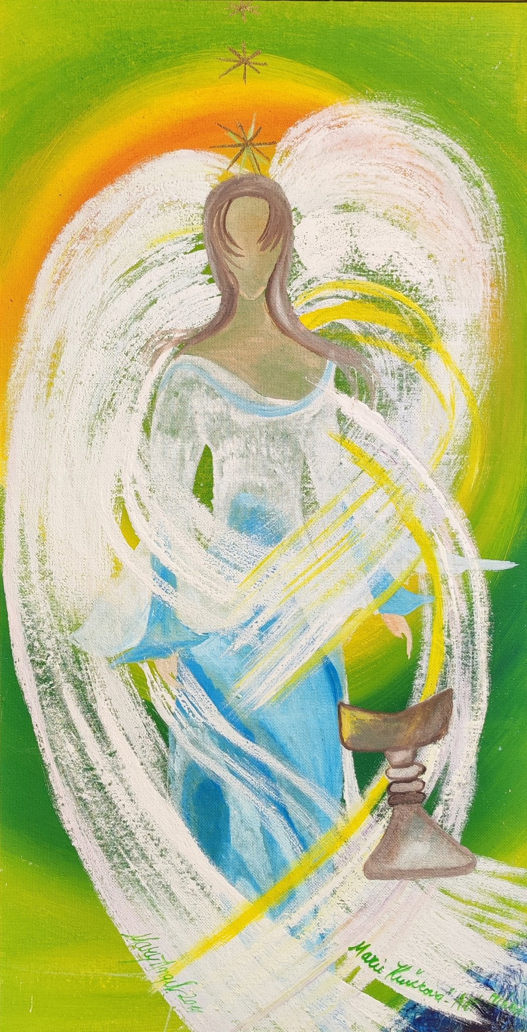 Zelené pozadie pôsobí stabilne a prirodzene, evokuje rast, kontinuitu a živú rovnováhu. Modré tóny odevu postavy prinášajú pokoj a čistotu, zatiaľ čo zlatisté akcenty v hornej časti obrazu zdôrazňujú hodnotu a význam bez prehnanej okázalosti.