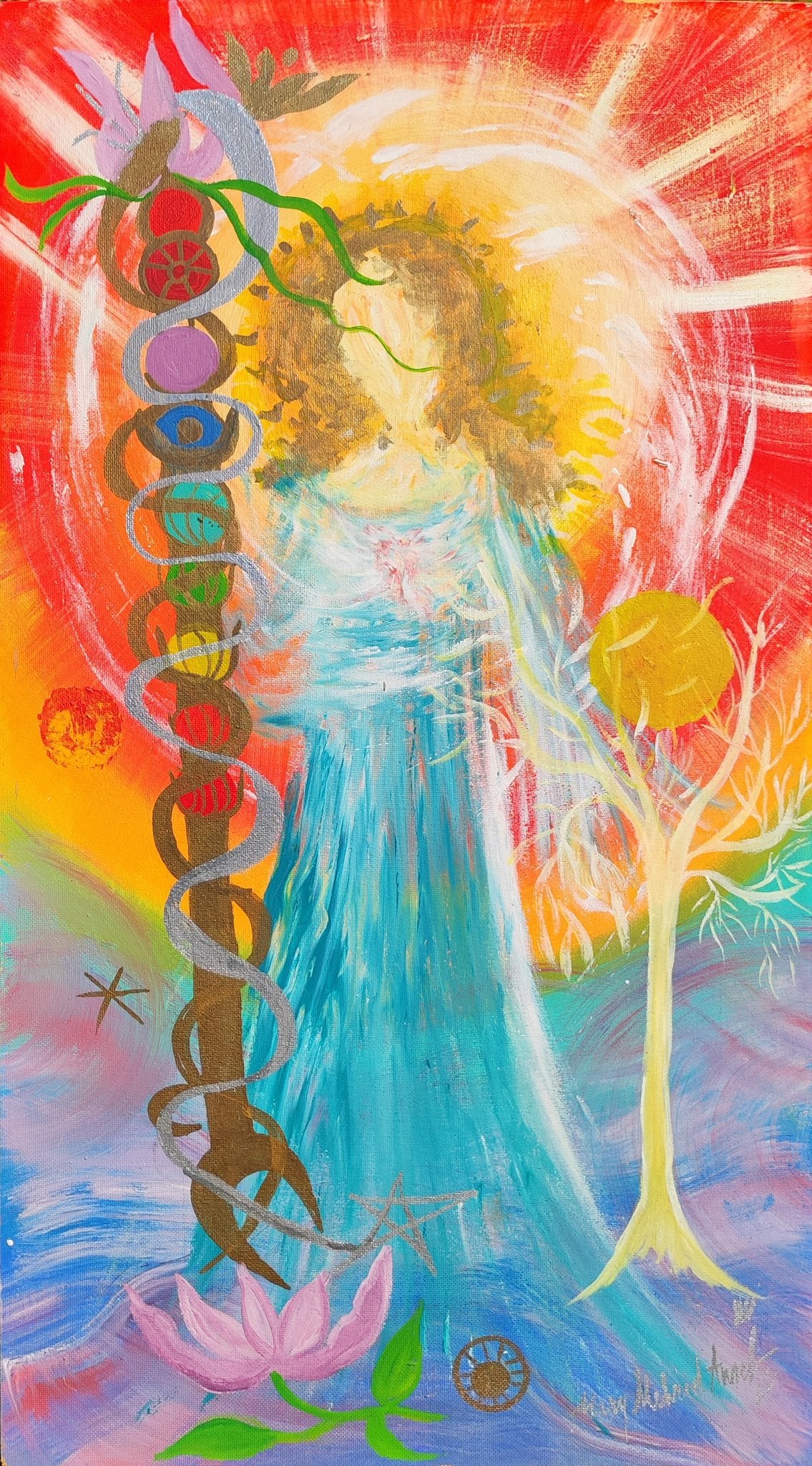 Farebná paleta je výrazná: teplé červené a zlaté tóny v hornej časti obrazu kontrastujú s chladnejšími modrými a tyrkysovými plochami v spodnej časti. Tento prechod podporuje myšliqu rovnováhy medzi impulzom a ukotvením. Svetelná aura okolo postavy pôsobí ochranným dojmom a stabilizuje celú kompozíciu.