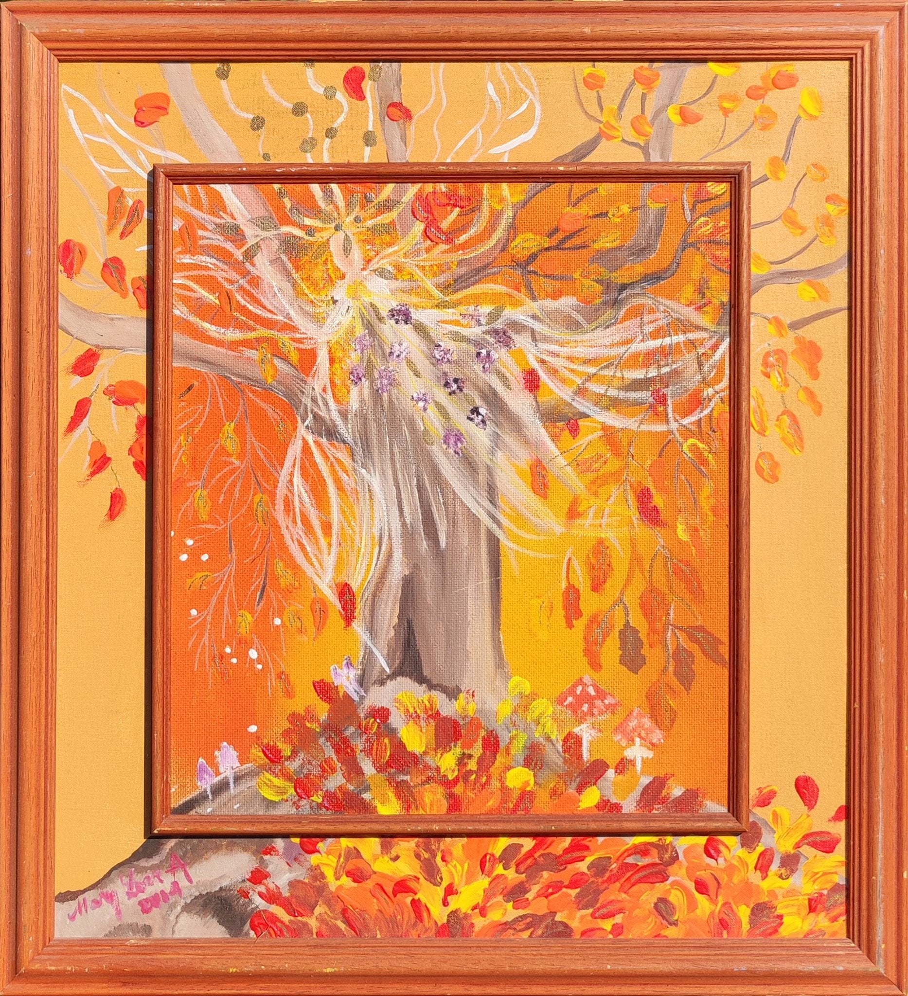 Teplé oranžové, zlaté a okrové tóny vytvárajú atmosféru jesennej hojnosti – obdobia, keď je rast završený a plody dozreté. Listy, kvety a drobné farebné akcenty sú rozmiestnené rytmicky, čím podporujú dojem živého, pulzujúceho ekosystému.